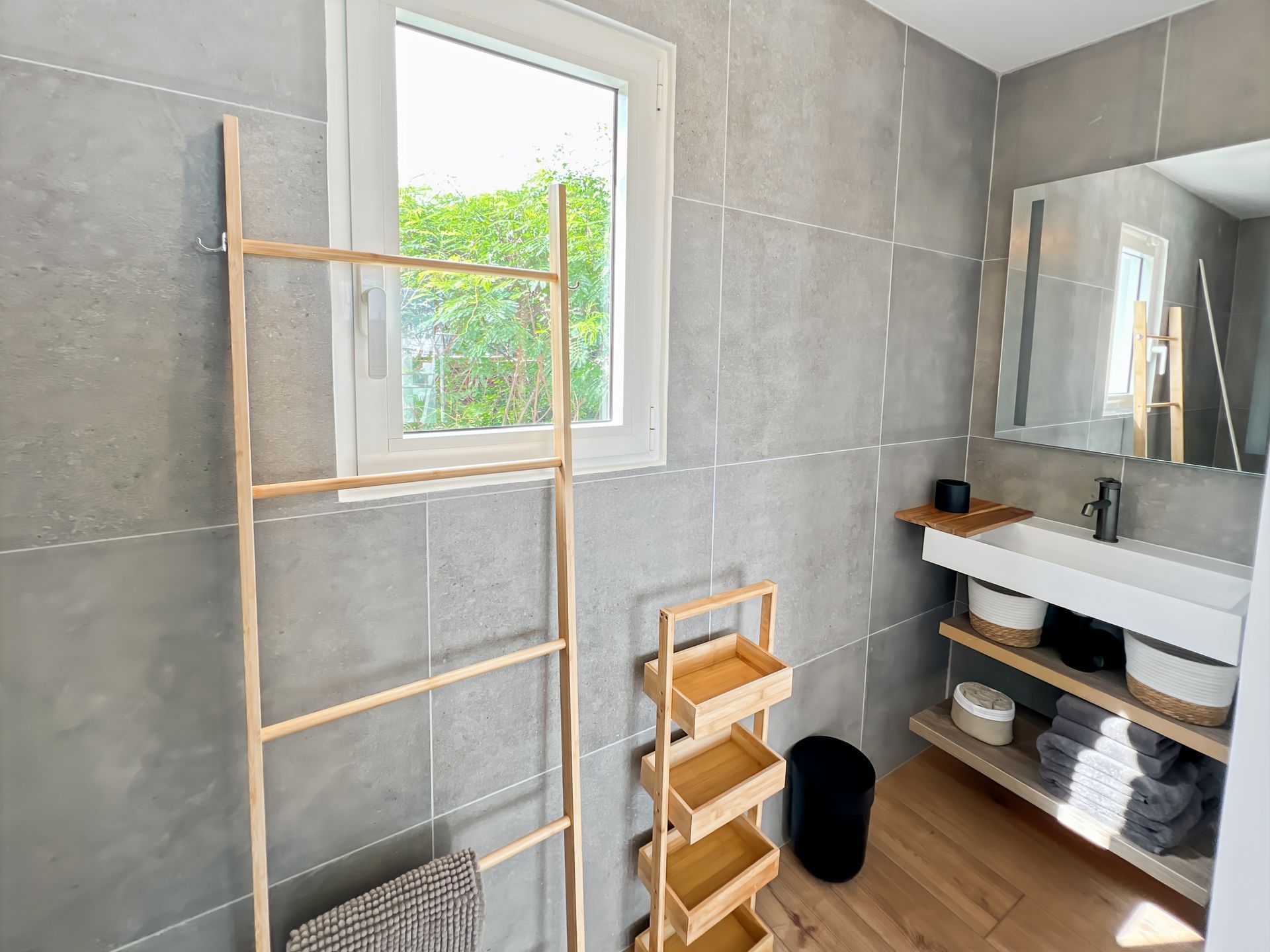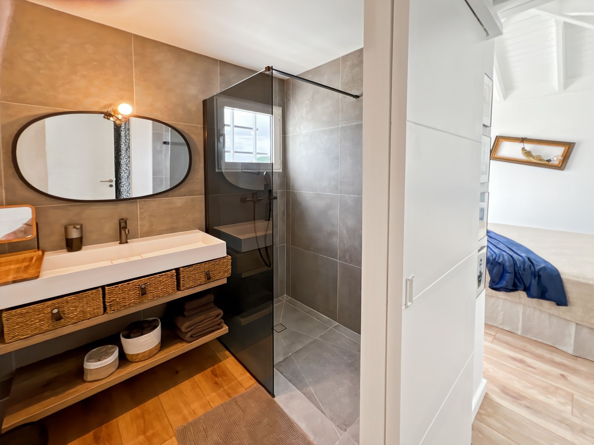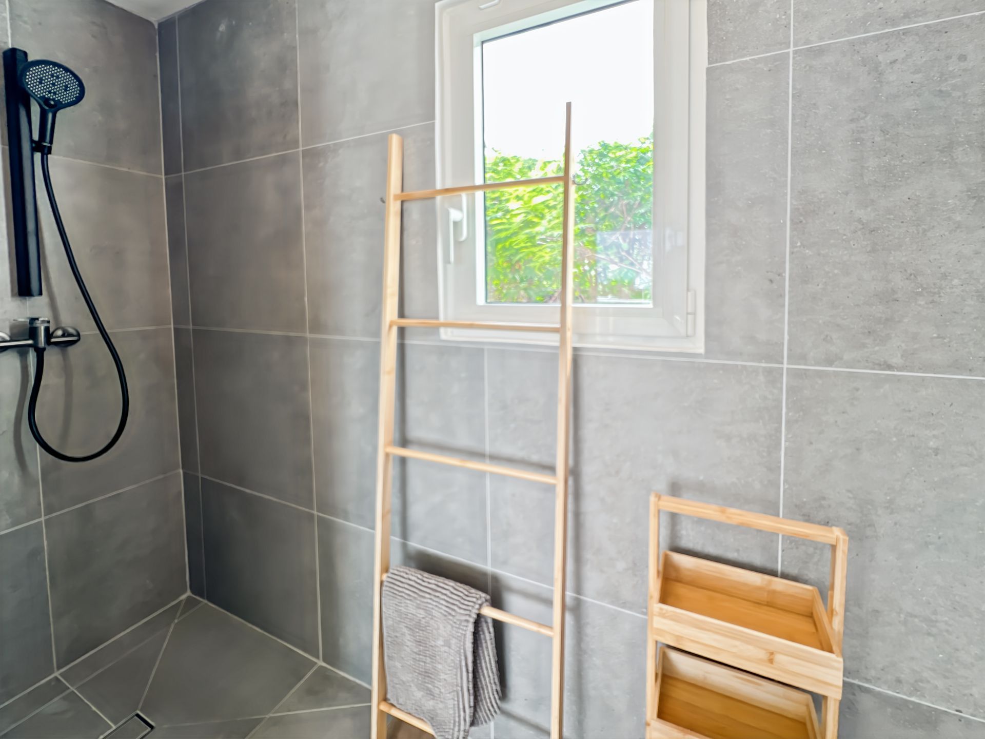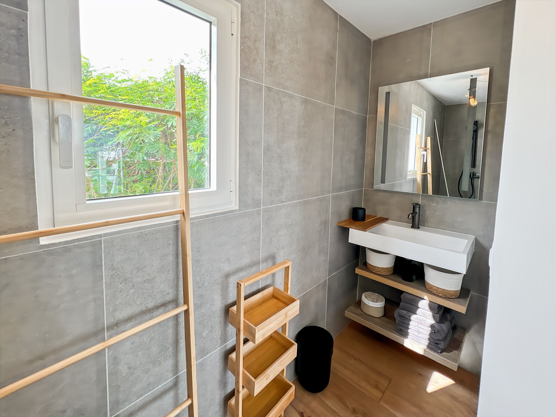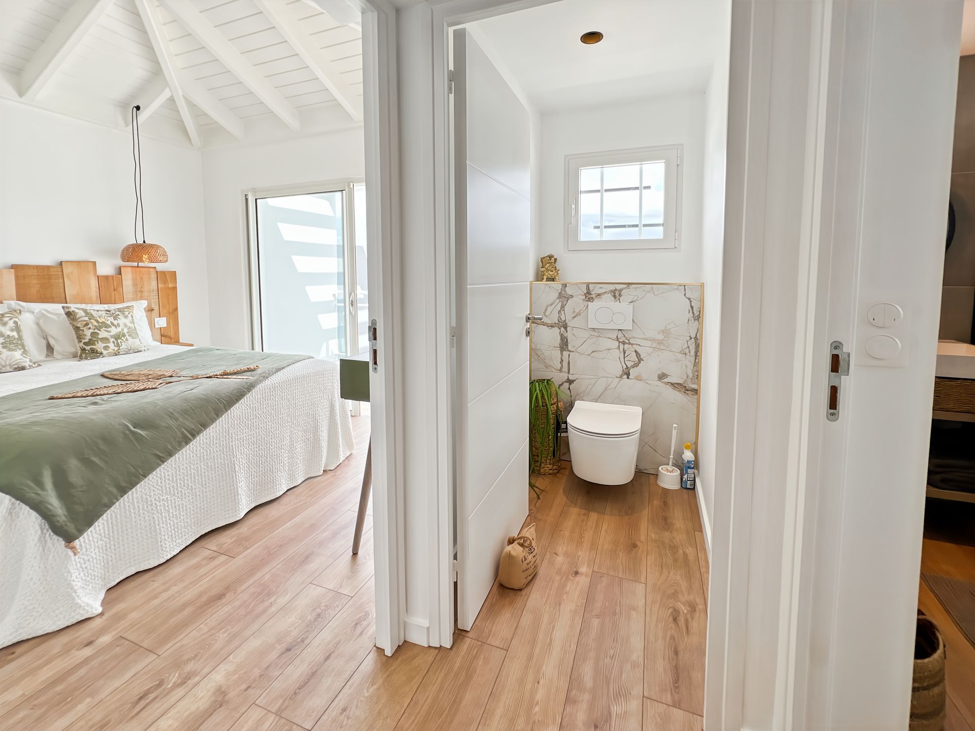 La maison offre deux chambres spacieuses et deux salles d’eau modernes, garantissant intimité et confort à chaque hôte.