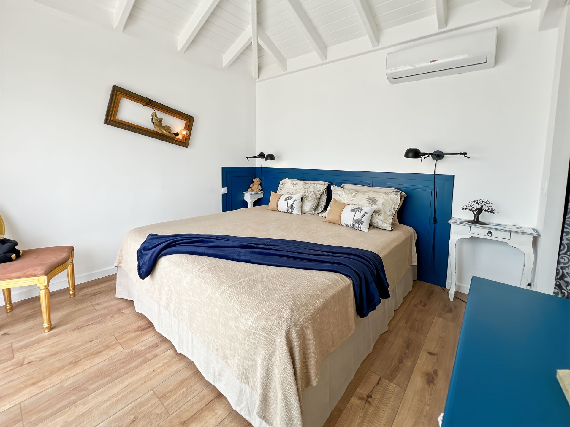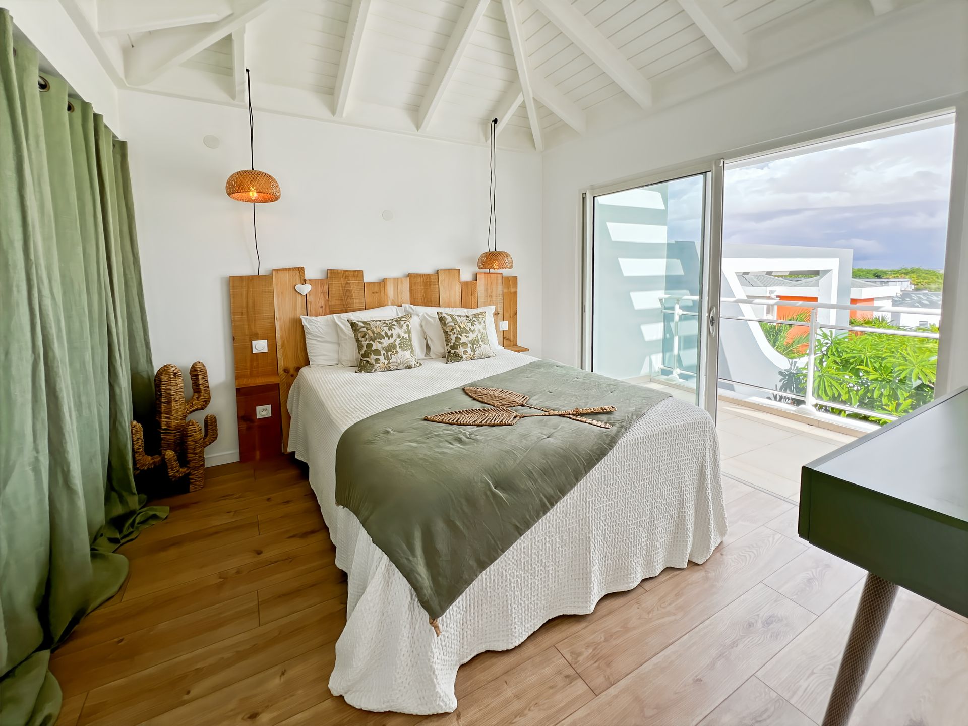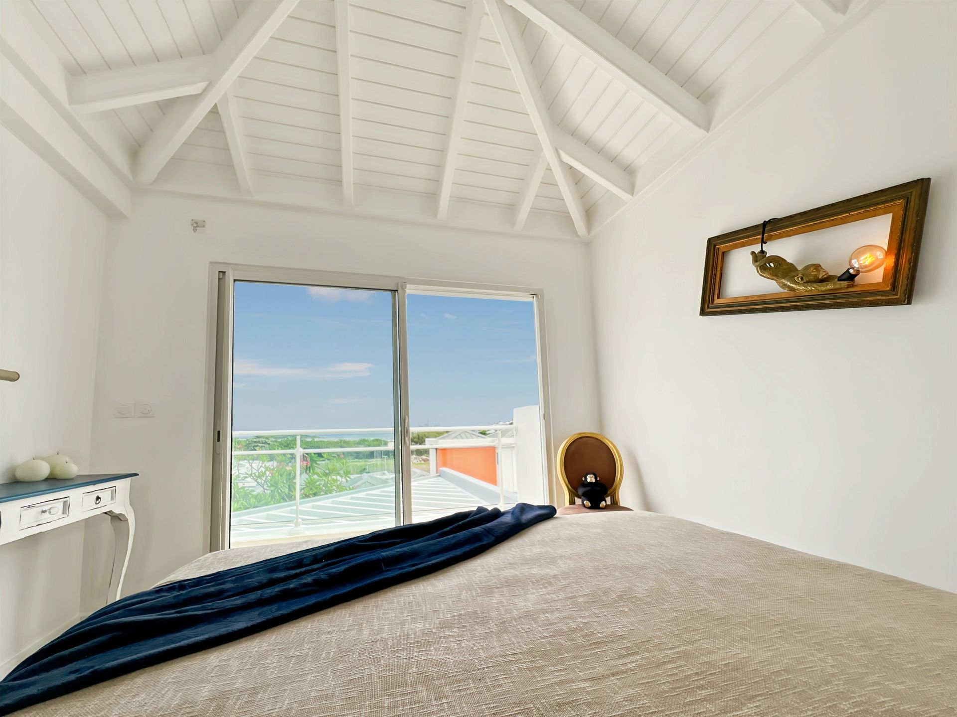 À l’étage, une seconde terrasse avec vue dégagée sur la Baie de Cul de Sac offre un cadre idyllique pour savourer un café au lever du soleil ou un verre au coucher du jour.