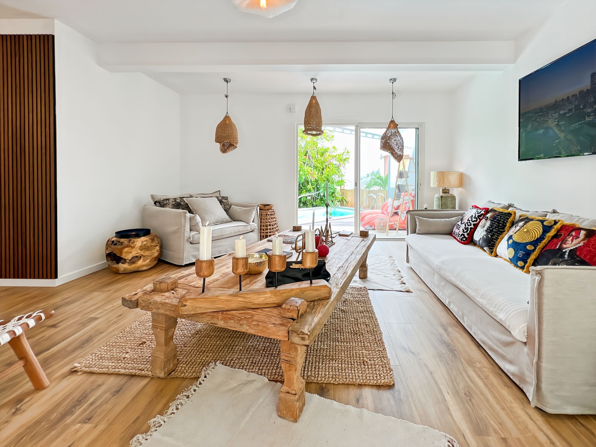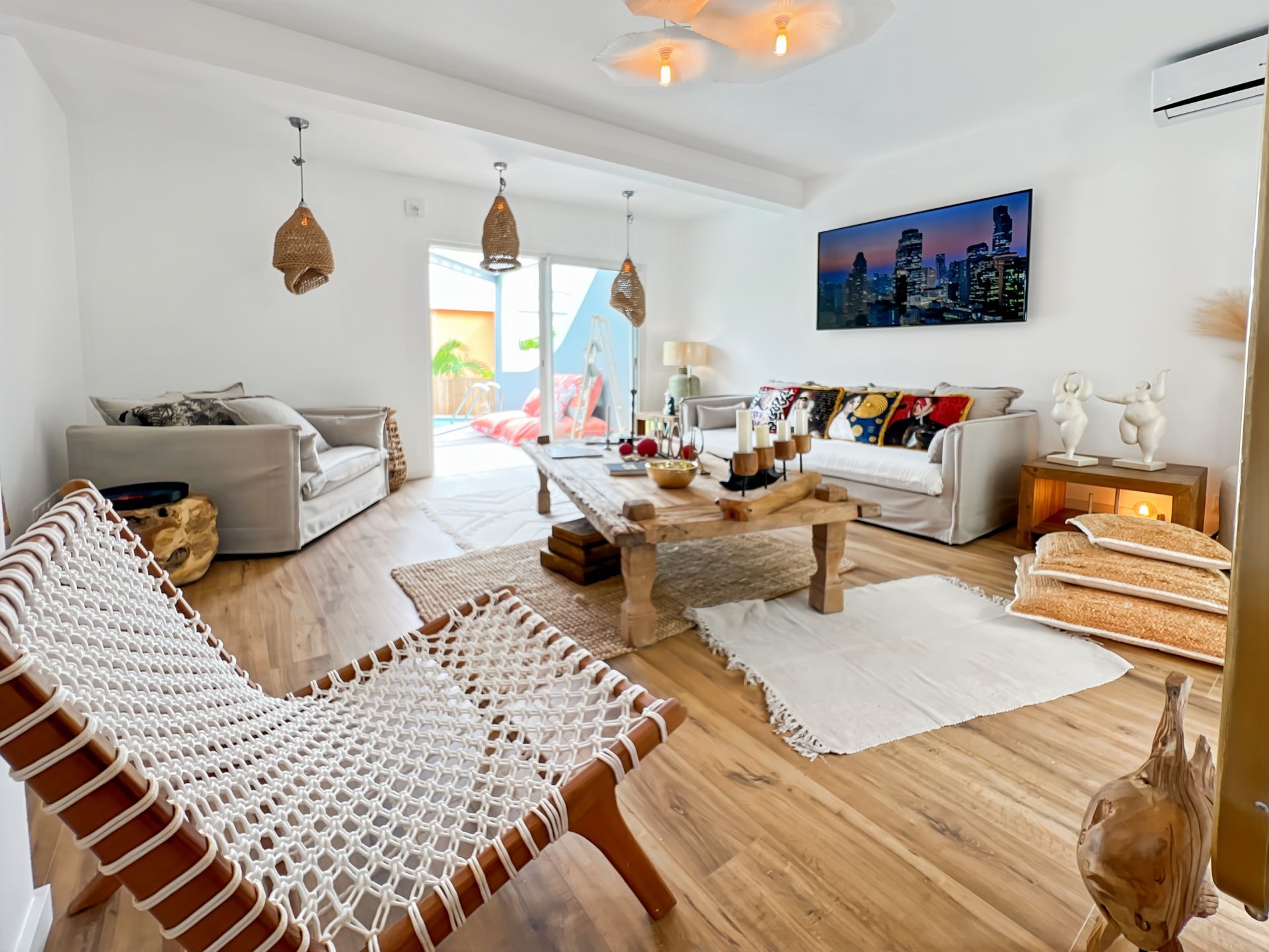 Le séjour lumineux s’ouvre sur l’extérieur et invite à la détente dans une ambiance chic et décontractée.