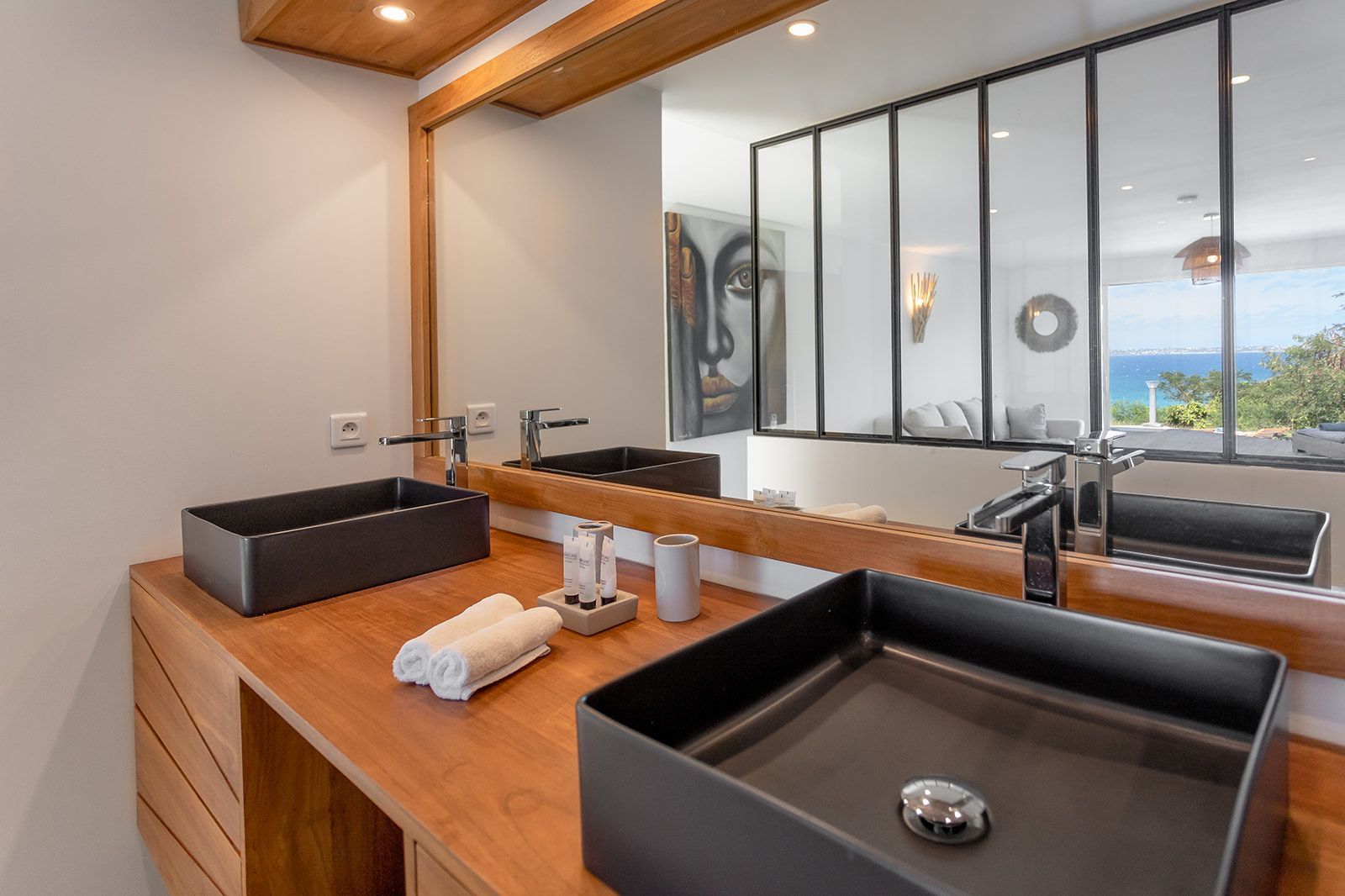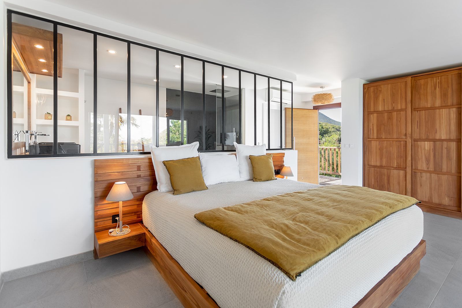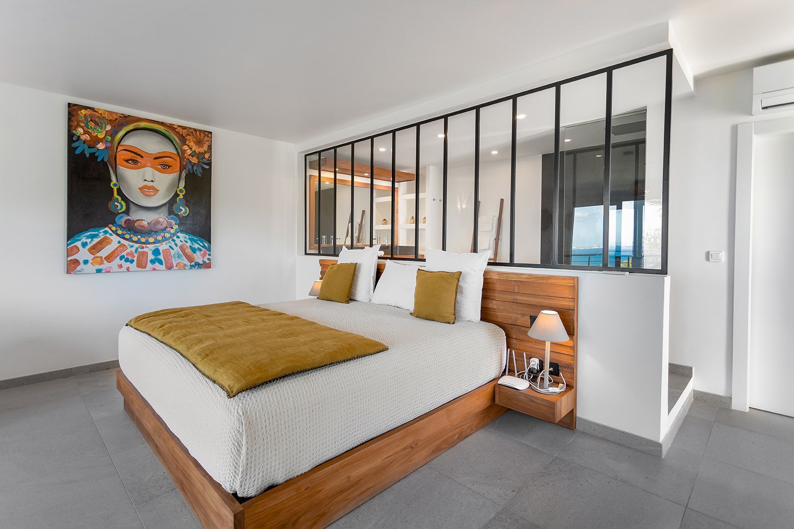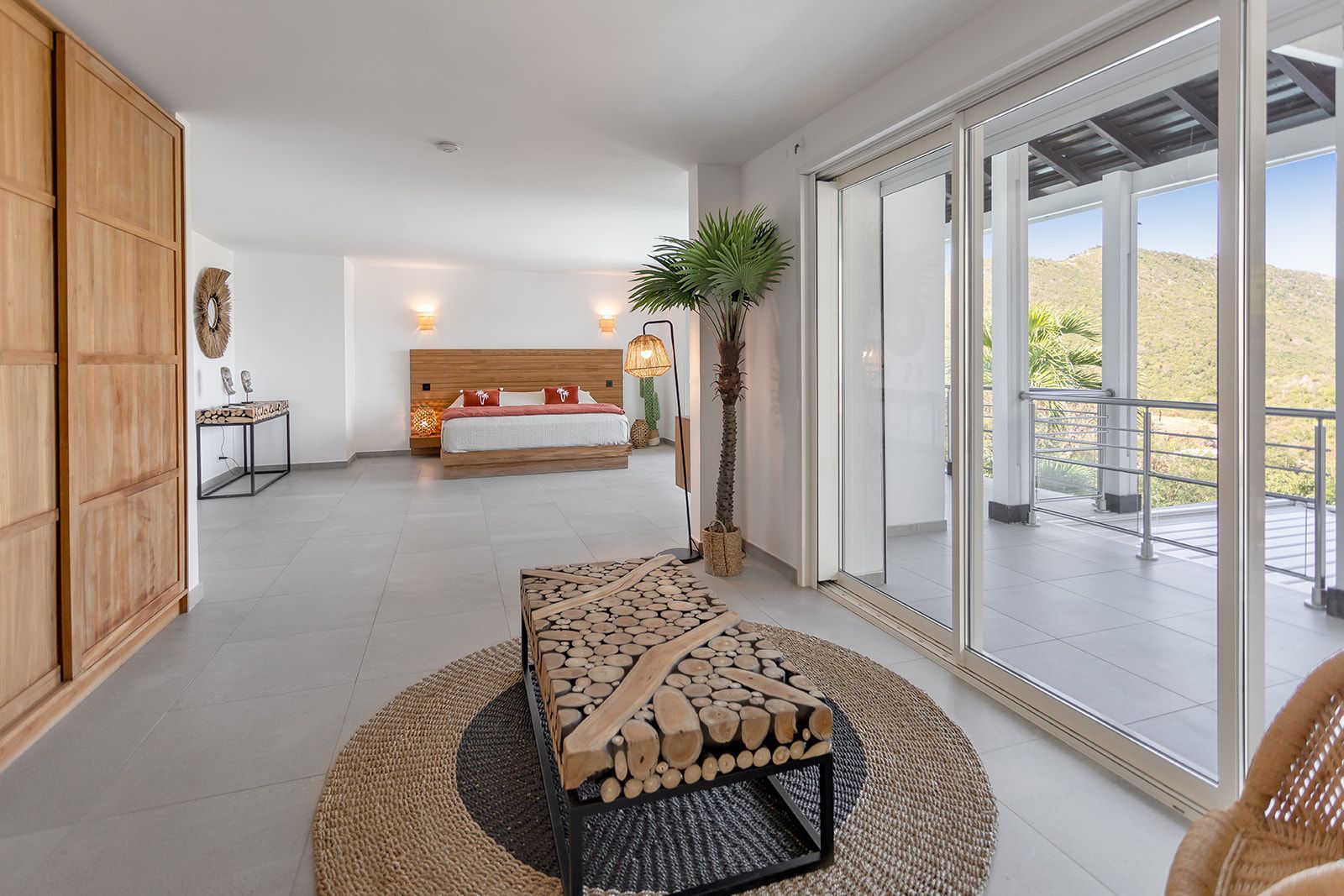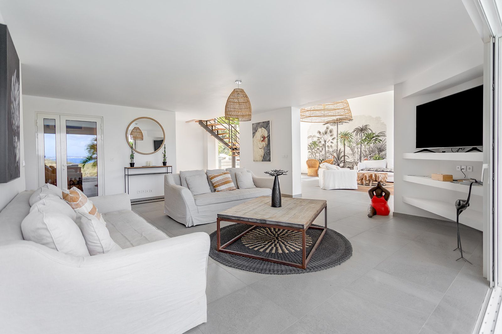 L'intérieur de la villa dévoile une décoration épurée et élégante, alliant harmonieusement modernité et charme caribéen. Les espaces de vie spacieux invitent à la détente, baignés par la lumière naturelle grâce aux larges baies vitrées offrant une vue époustouflante dès l'entrée dans la villa.