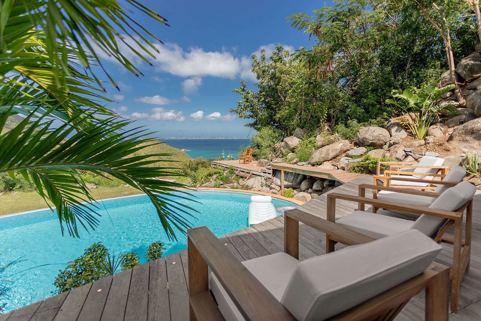 Bienvenue à la Villa Caye Blanche, perchée à flanc de colline dans le quartier exclusif d'Anse Marcel à Saint-Martin. Cette résidence d'exception offre une vue à couper le souffle sur la mer des Caraïbes.
