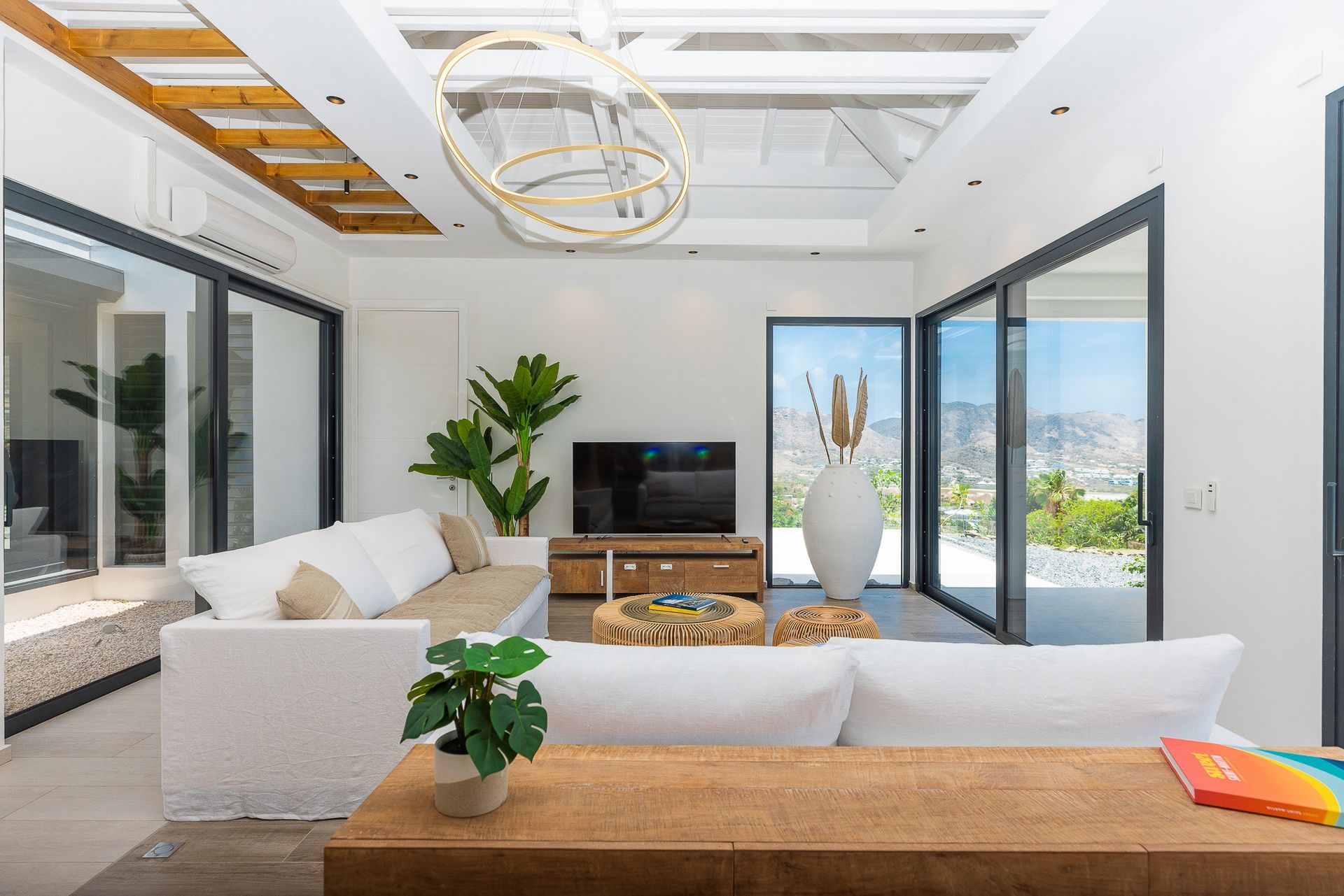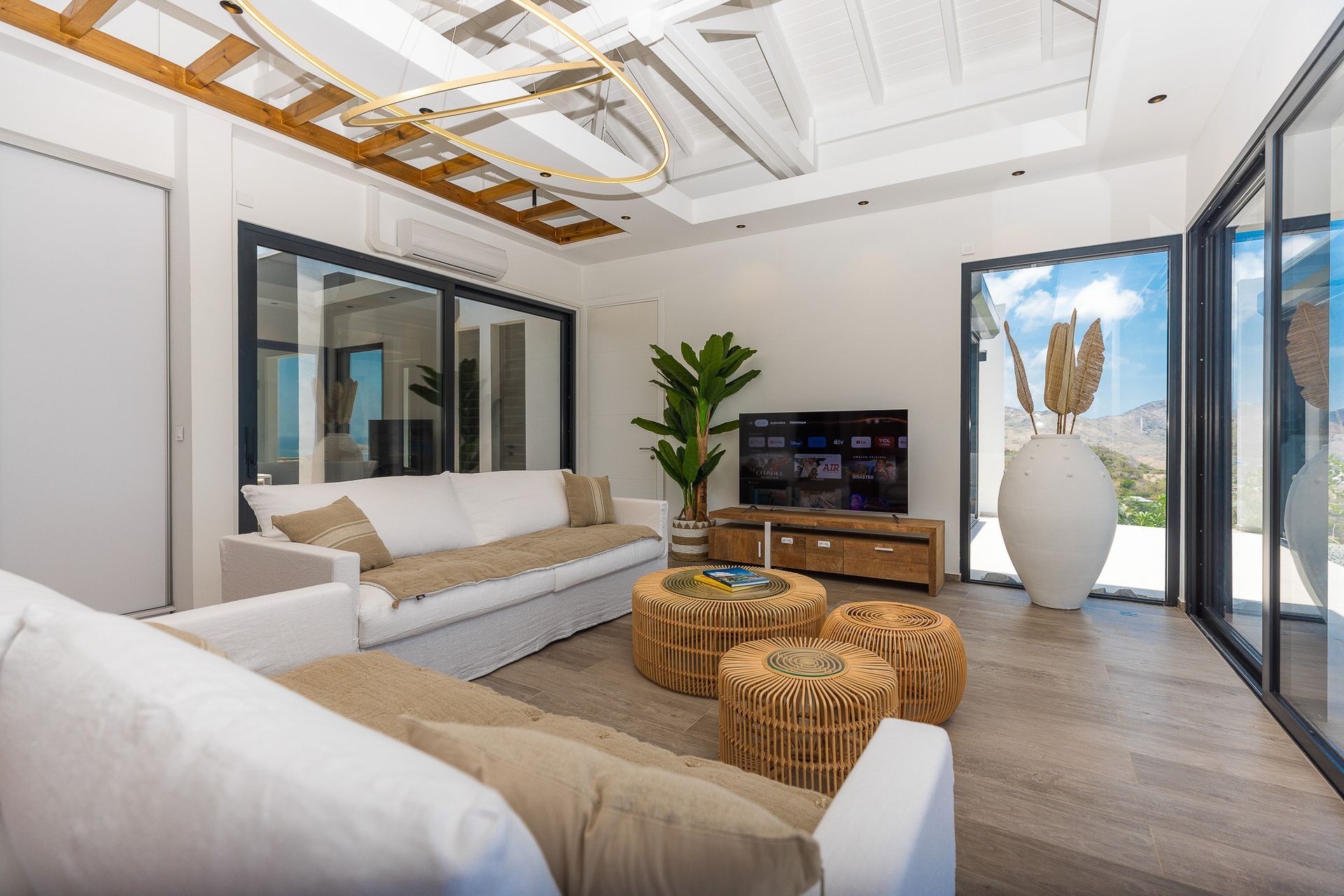 Les espaces de vie intérieurs sont tout aussi impressionnants, avec un grand salon ouvert, des meubles contemporains et une cuisine entièrement équipée, parfaite pour préparer de délicieux repas. La luminosité naturelle inonde chaque coin de la villa, créant une atmosphère où règnent sérénité et calme.