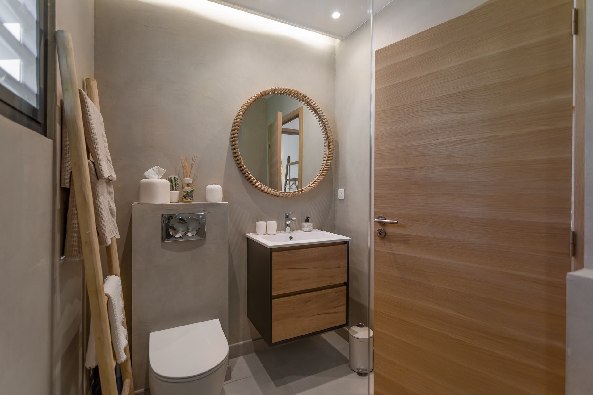 Step inside and you’ll discover a spacious, light-filled living area, tastefully decorated in a chic, tropical style. The living room opens seamlessly onto theexpansive terrace, which flows into a private pool, a small stretch of sandy beach, and then directly into the bay’s turquoise waters. Here, the line between indoor and outdoor living disappears, leaving only the beauty of the view and the serenity of island life.