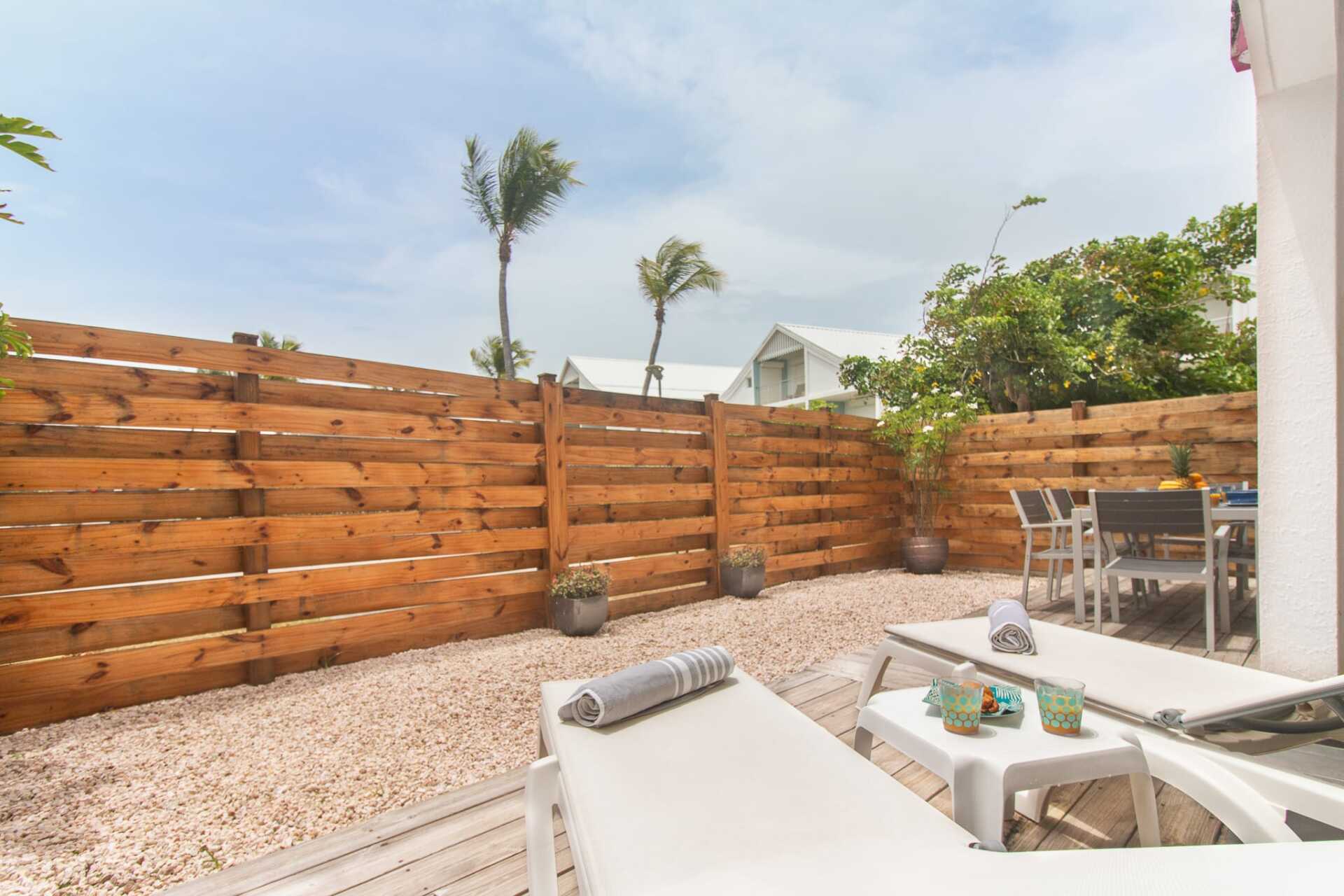 Step out of the apartment and follow the small path that leads you directly to the white sands of Orient Bay.