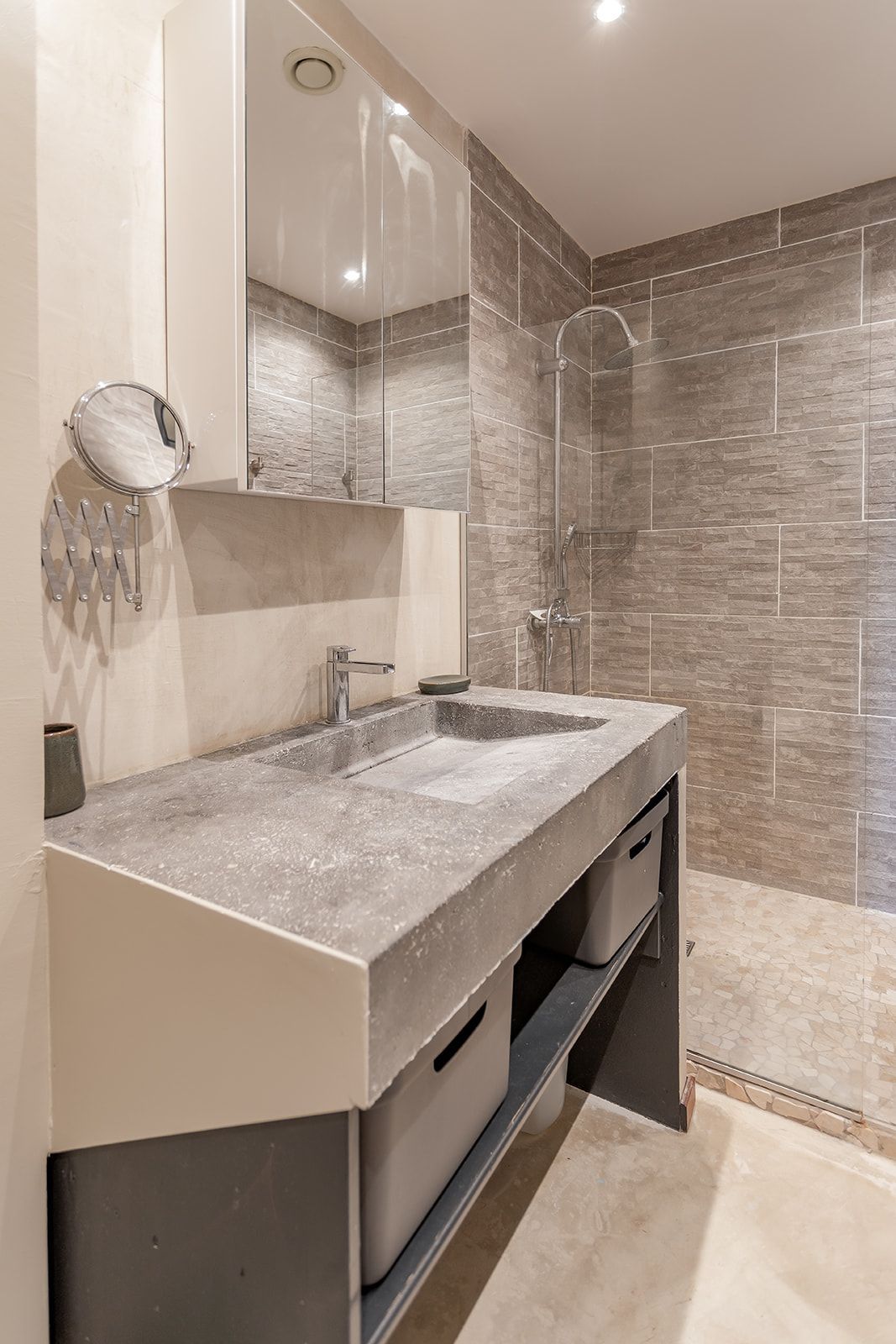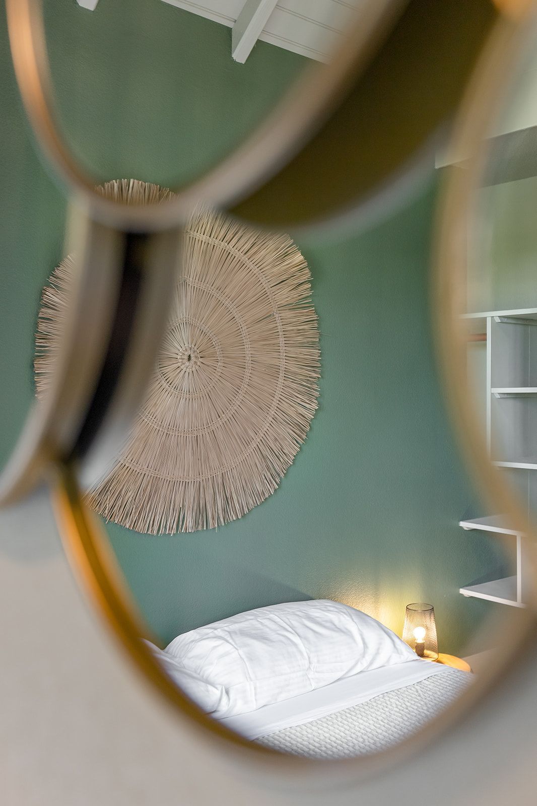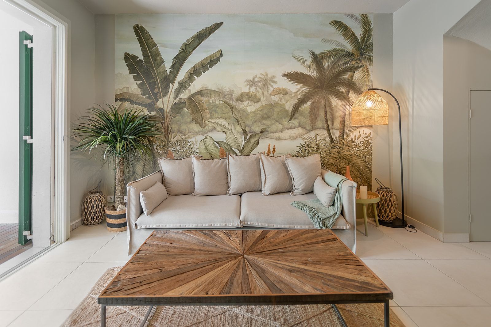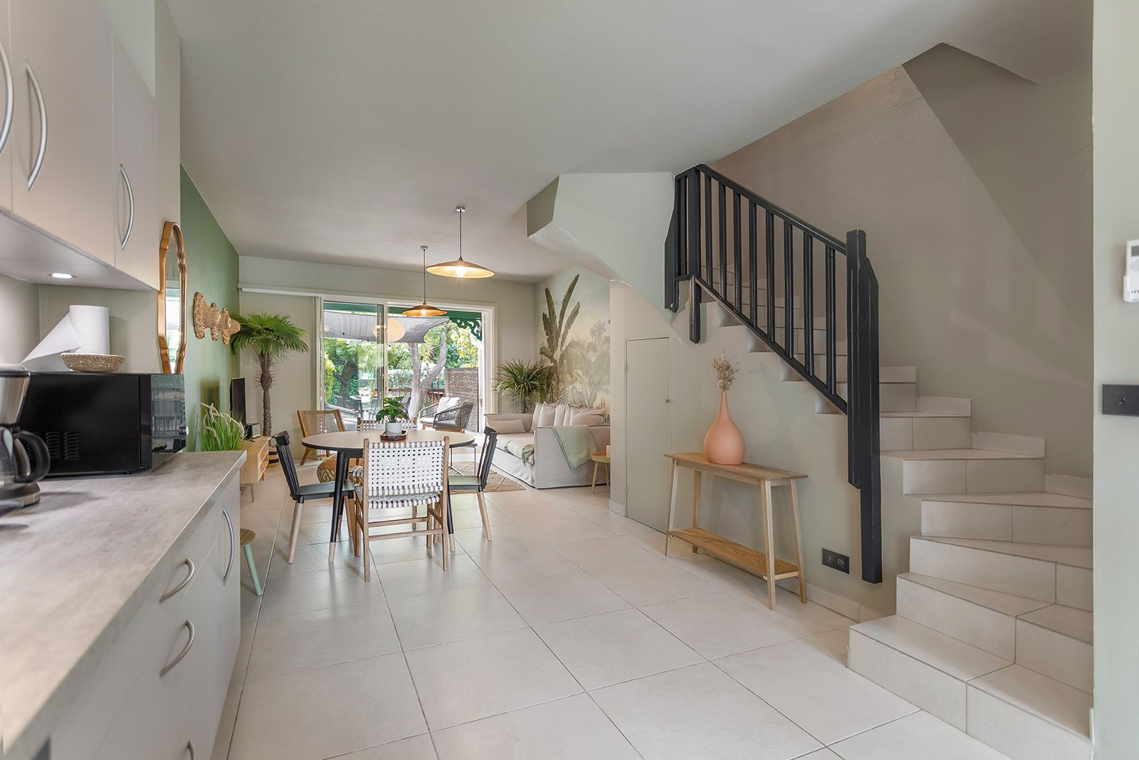 On the ground floor, the open and fully equipped kitchen opens up to the tastefully decorated living room in natural tones.