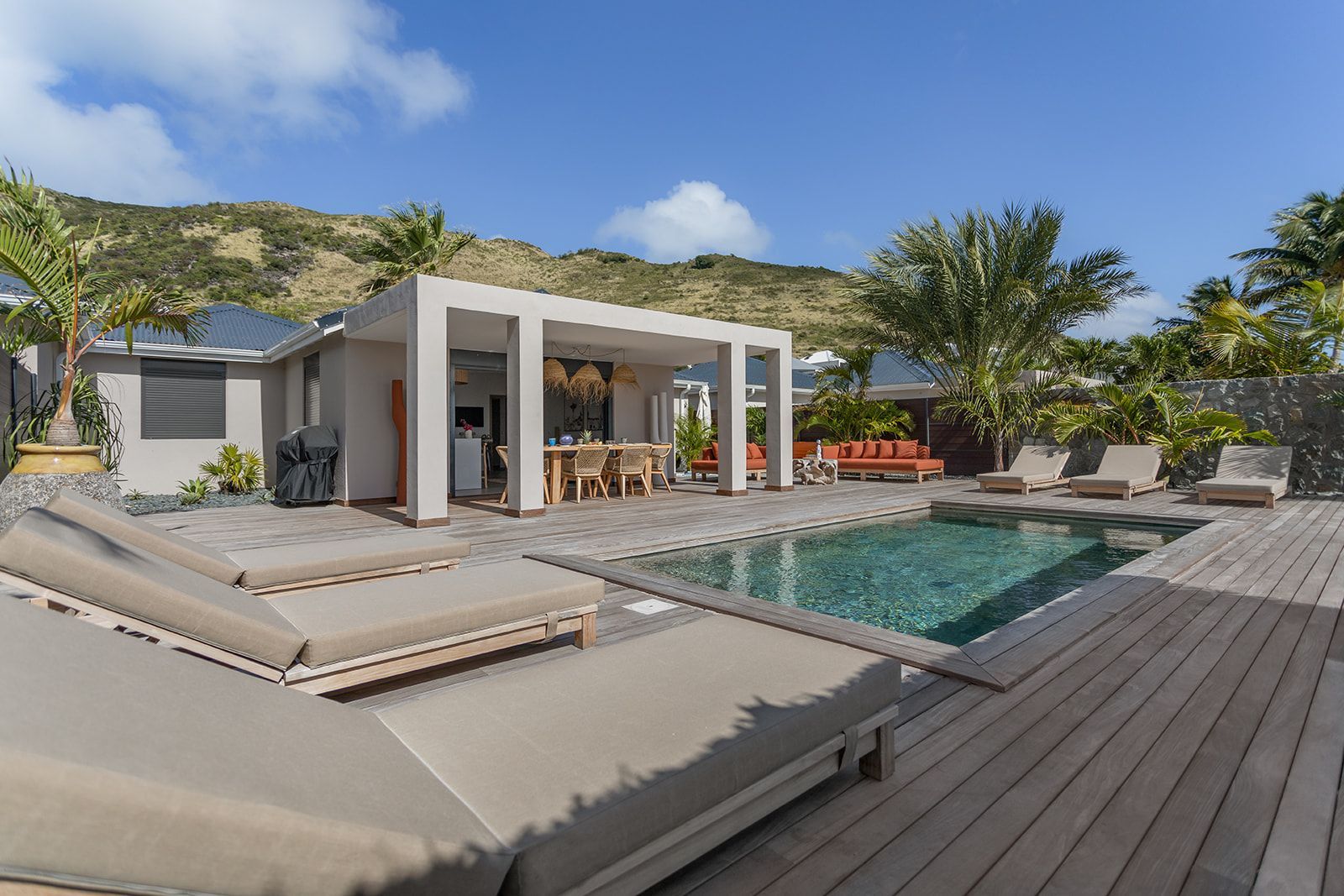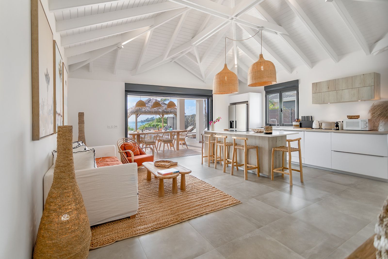 Step into your own tropical sanctuary, where an expansive outdoor living space awaits. Savor al fresco meals on the shaded terrace, unwind in stylish lounge areas with a cocktail in hand, or relax under the charming gazebo as you take in sweeping views of Pinel Island and St. Barts across the turquoise sea.