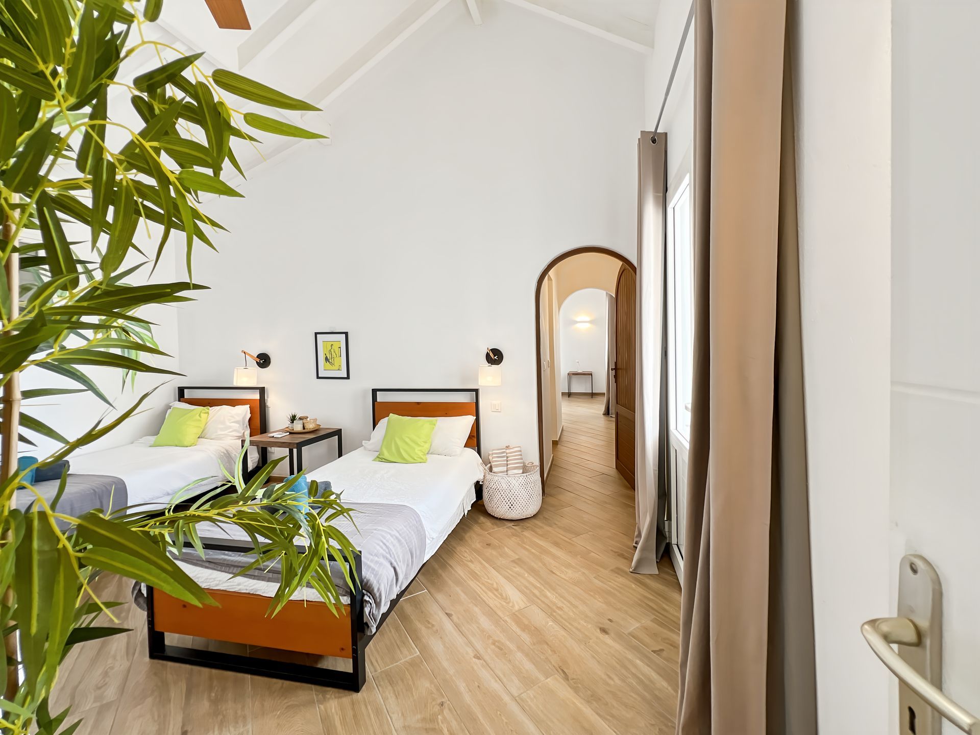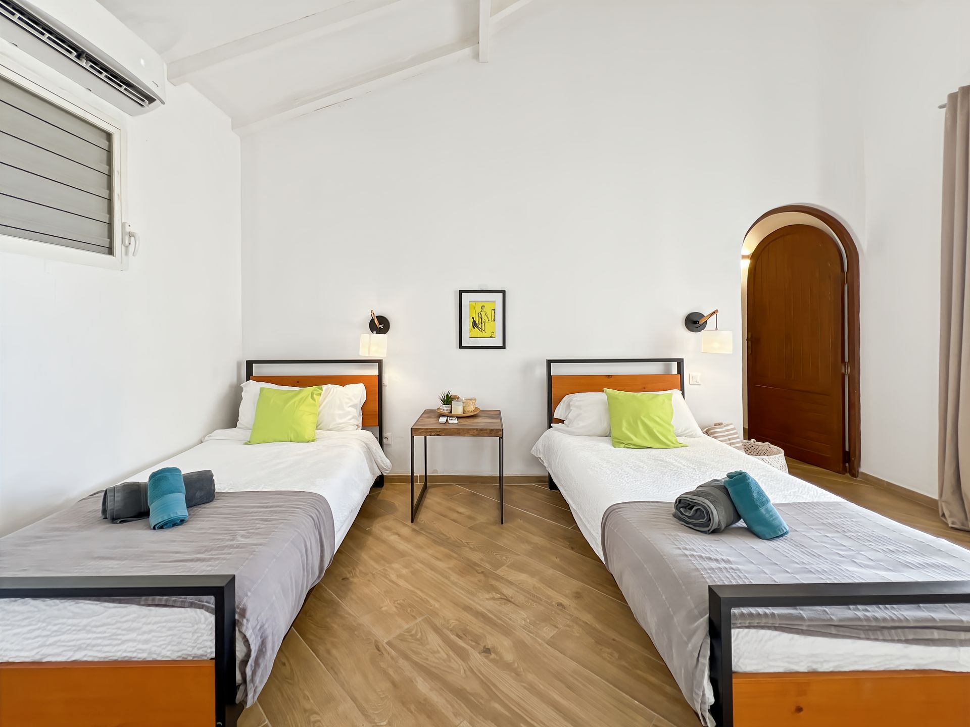 It features 2 connecting rooms with their own bathroom, one with Twin beds, the other with King size bed. Both bedrooms have access to the terrace.