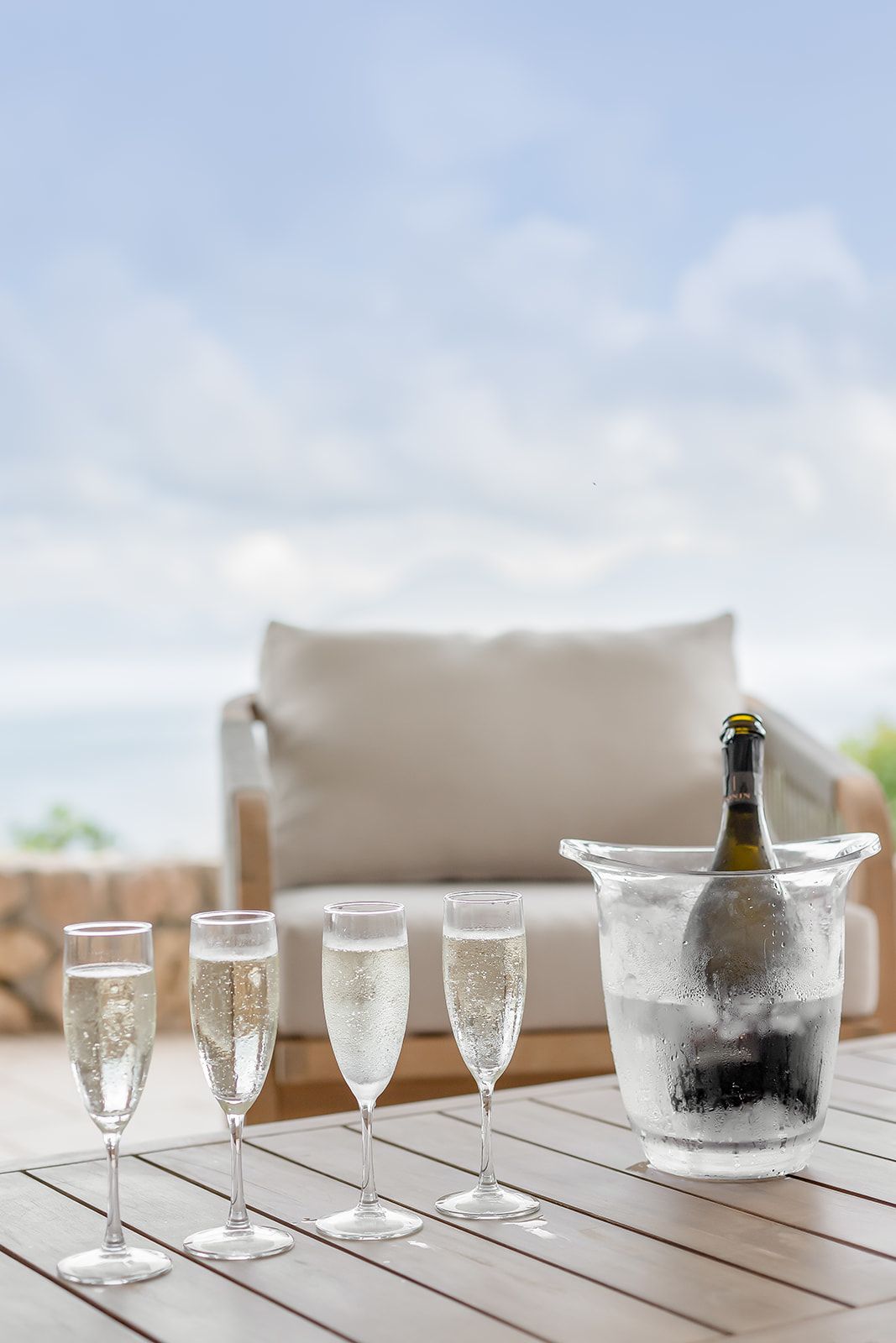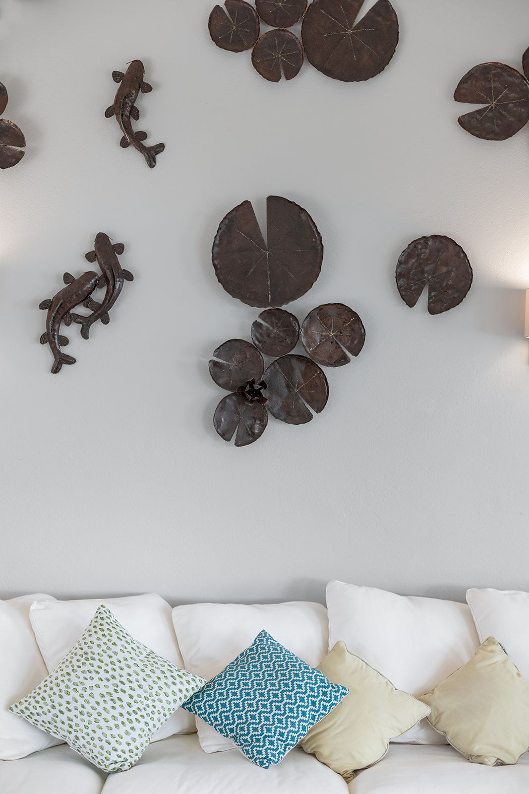 On the beautifully adorned stone terrace, you can choose between swimming in the plunge pool, relaxing on a sun chair, and admiring the palm trees dancing in the constant sea breeze. Moving from the pool deck to the covered terrace, you will discover an outdoor living room area with dining spot.
