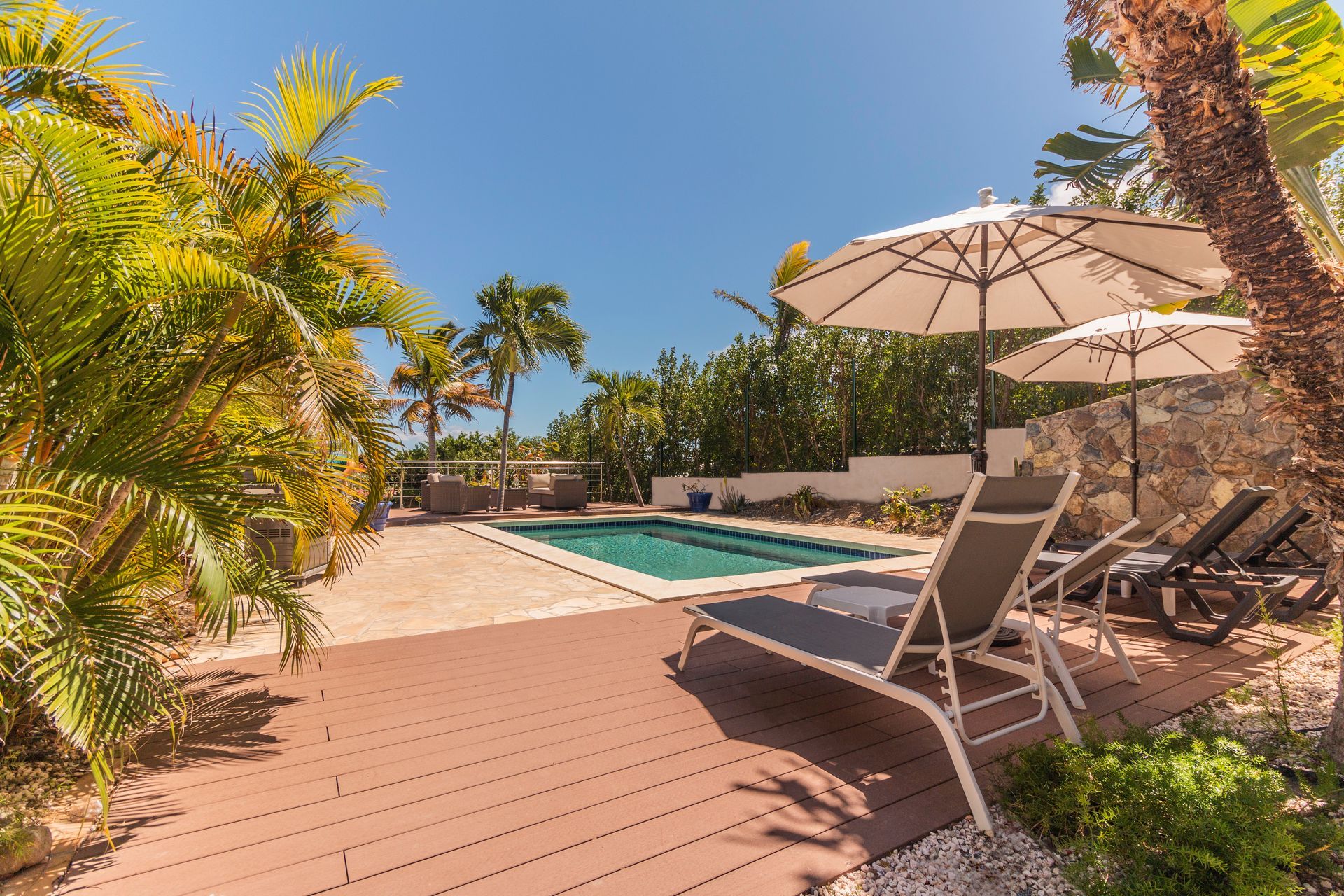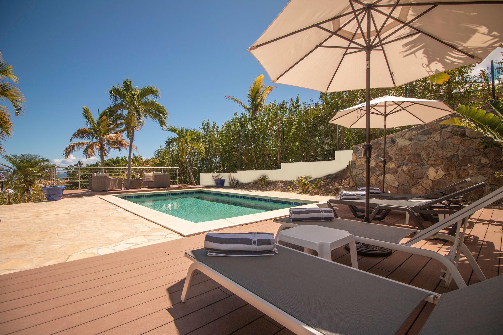 The private pool is surrounded by a deck and a second terrace with a garden lounge and sun loungers.