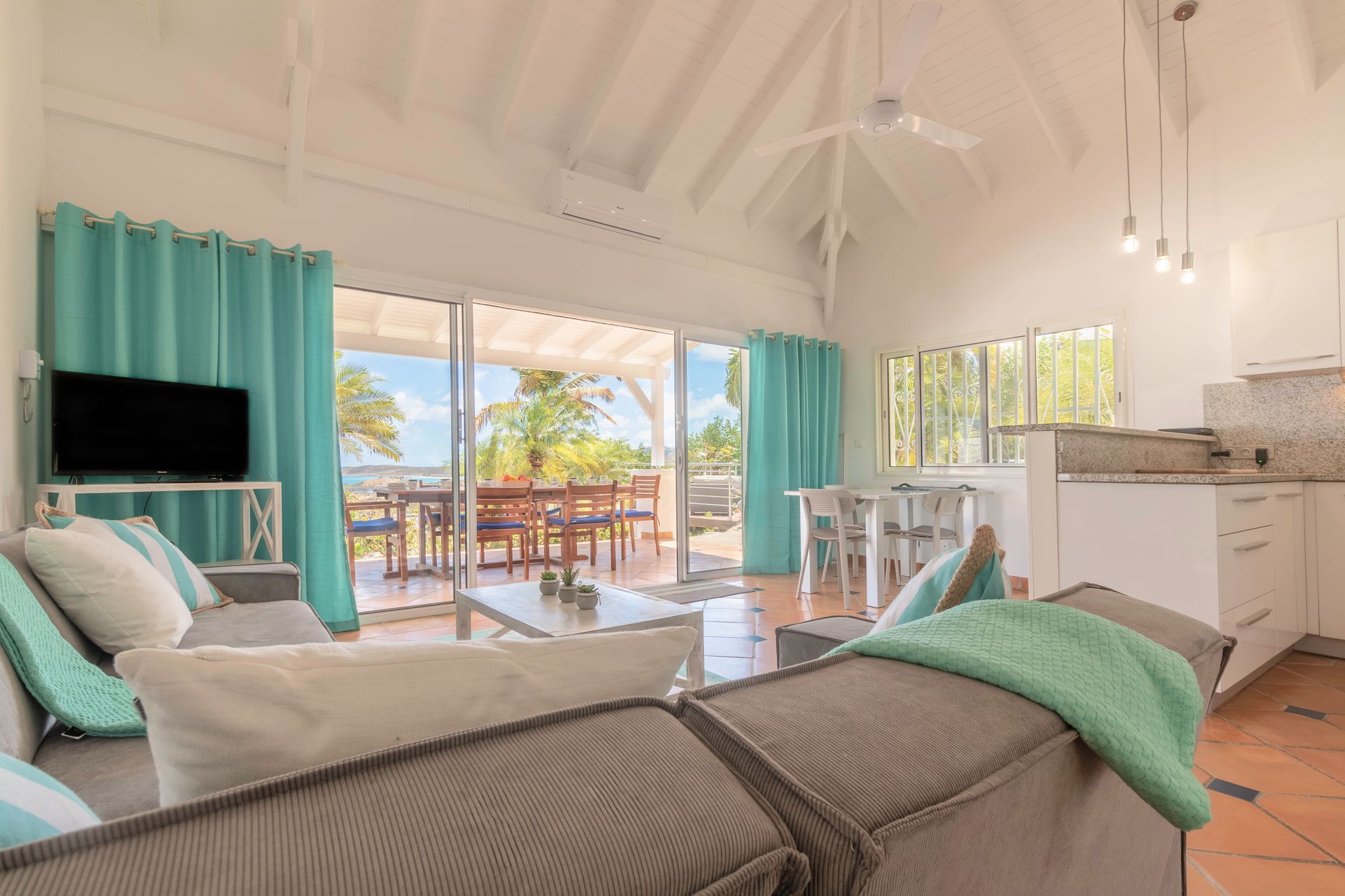 The villa also features a fully equipped kitchen, and a bright living room open to a large covered terrace.