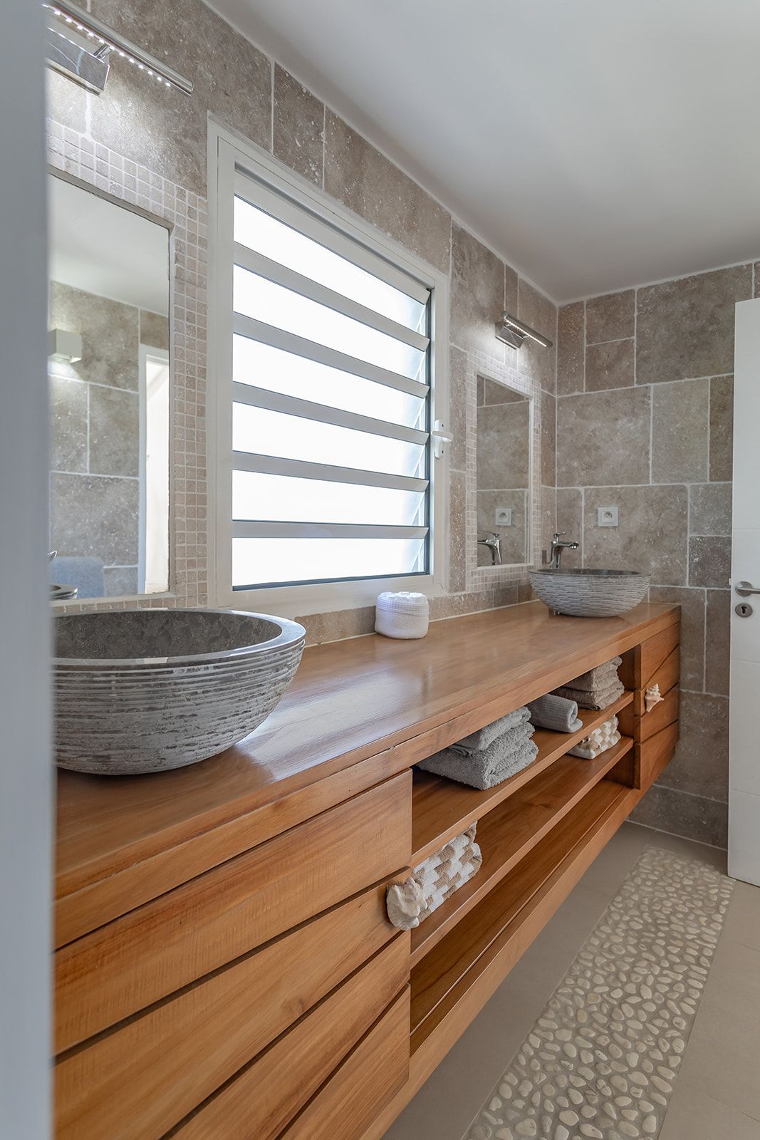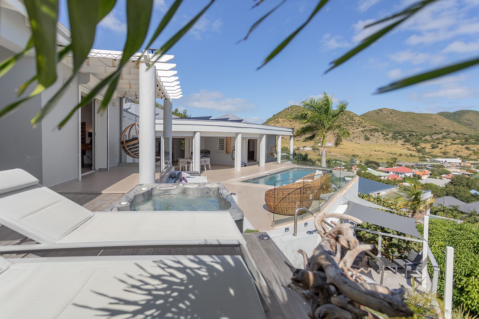 The villa’s outdoor spaces are equally impressive. The sea-view terrace is home to a salt-treated swimming pool, a relaxing jacuzzi with panoramic views of Orient Bay, and sun loungers for soaking up the sun. A plancha grill makes outdoor barbecues a delight, while a shower room with a toilet adds convenience.