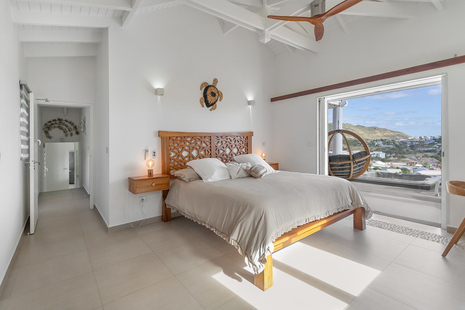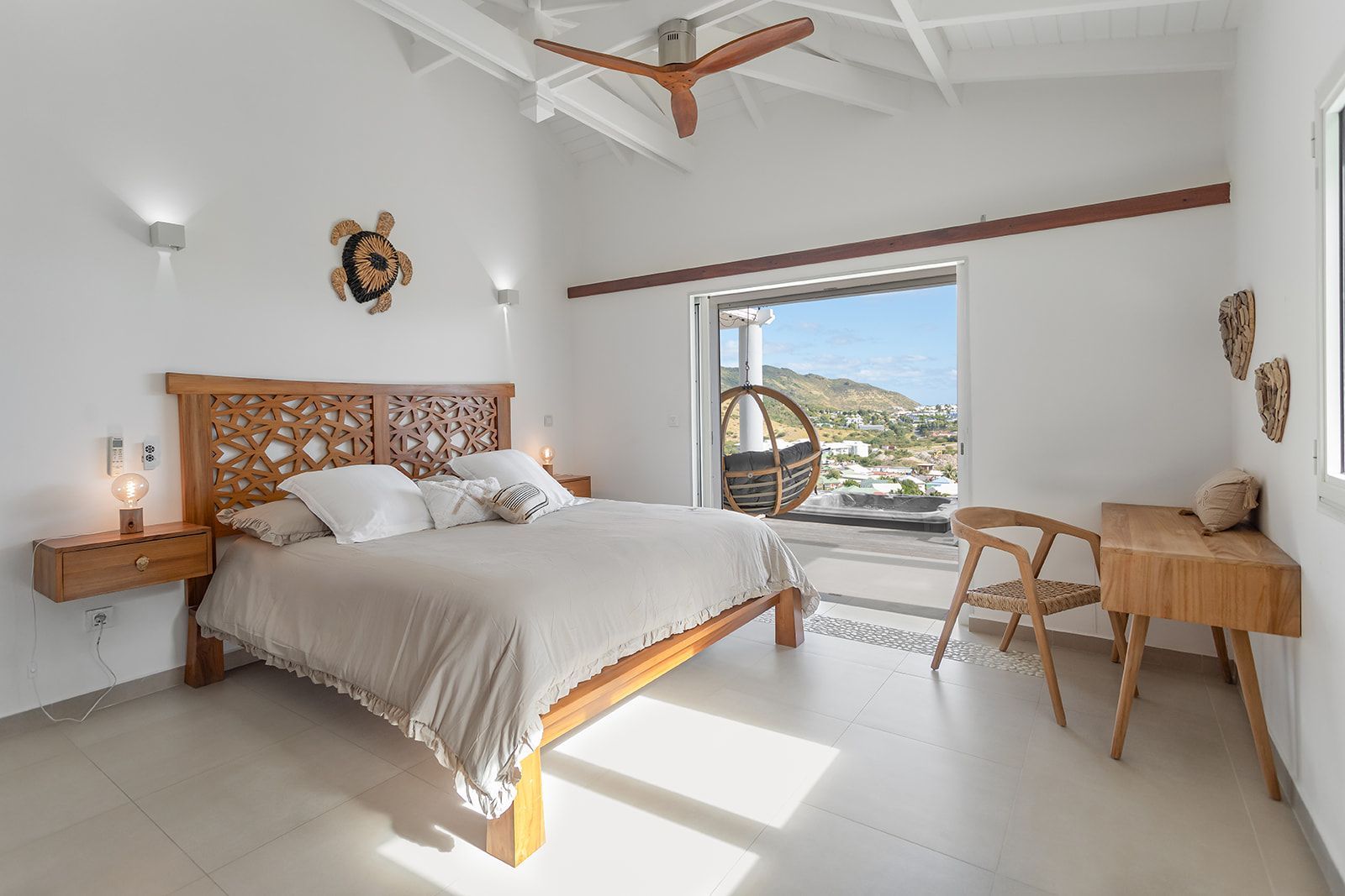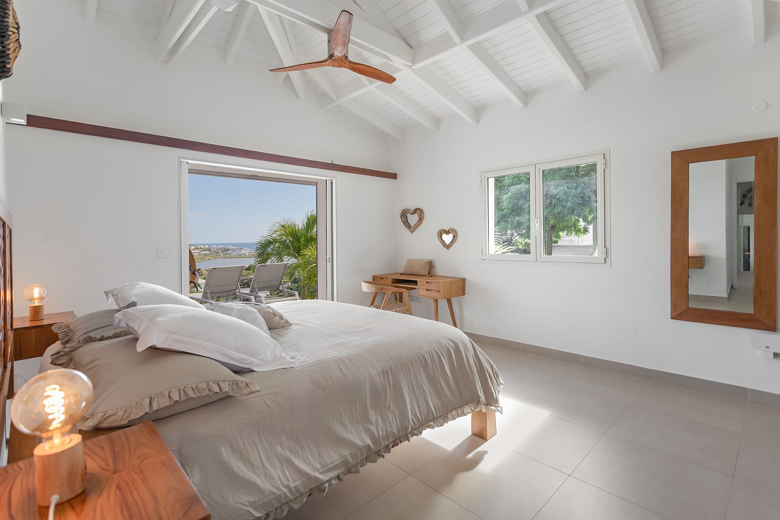 Villa Venus is a stunning villa, perched in the heights of Mont Vernon in Saint Martin. It offers generous spaces and elegant volumes, perfectly designed to accommodate up to 8 guests. The property features 3 air-conditioned bedrooms, each with a king-size bed (180 x 200), a dressing room, and an en-suite bathroom with a shower. All three bedrooms are located on the main level and boast breathtaking sea views. For groups of 8, an independent studio is included as a 4th bedroom, offering complete privacy with its own kitchen, a marble walk-in shower, and a TV, ensuring maximum comfort.